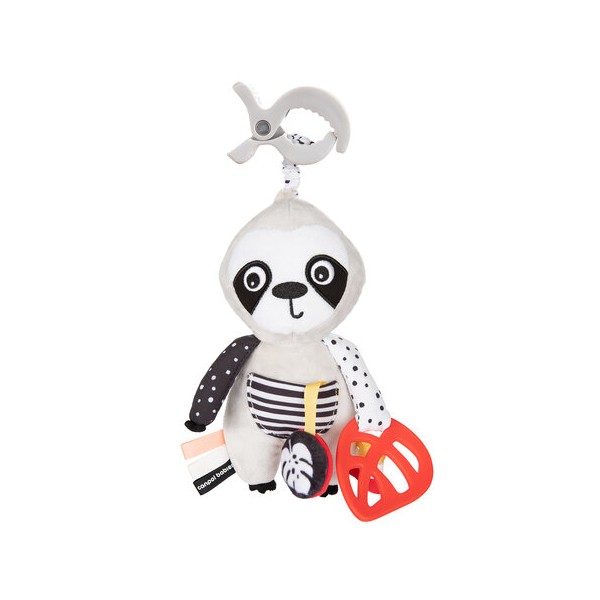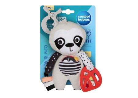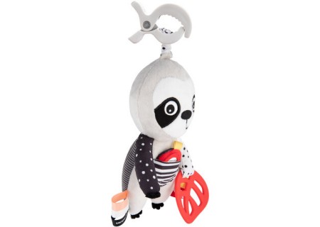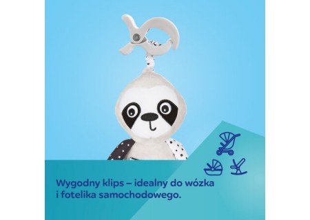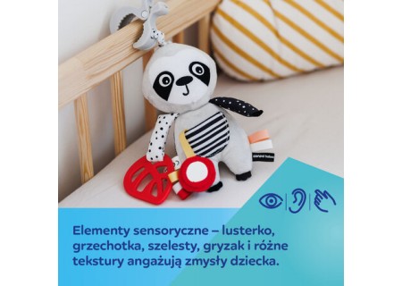 Interaktywna zabawka sensoryczna Canpol babies BabiesBoo LENIWIEC będzie doskonałym towarzyszem spacerów i podróży. Posiada wygodny klips, który pozwala na zamontowanie go do wózka, fotelika samochodowego, łóżeczka, a także jako dodatkowy element do sensorycznej maty edukacyjnej Canpol babies. Dodatkowe szeleszczące elementy, gryzak, lusterko oraz delikatnie dzwoniąca grzechotka są interesujące dla dziecka w okresie poznawania świata. Leniwiec został wykonany z miękkich i miłych materiałów, ale tak aby różnorodność tekstur – pluszowe, sztruksowe, łapki wypełnione „groszkiem” czy doszyte kolorowe metki zapewniały sensoryczne doznania i dziecko uczyło się przez dotyk wrażliwości na różne struktury. Kontrastowe kolory i wzory wspierają prawidłowy rozwój zmysłu wzroku u dziecka. Leniwiec ma z przodu kieszonkę, do której można schować przyczepione na tasiemce lusterko lub inne niewielkie skarby – np. znalezionego na spacerze żołędzia. Sensoryczna zabawka interaktywna Canpol babies będzie towarzyszył Maluszkowi w codziennych przygodach już od pierwszego dnia życia i wspólnie będą odkrywać świat. Przyjacielska sensoryczna zabawka interaktywna Canpol babies LENIWIEC będzie bawiła, uczyła i relaksowała – to doskonały towarzysz codziennych zabaw, spacerów oraz wycieczek.