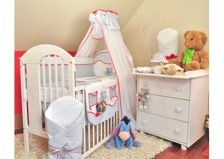 7. Moskitiera z szyfonu 480 x 160 cm – dużych rozmiarów moskitiera zabezpieczająca łóżeczko dziecięce przed owadami, w tym komarami i muchami. Przysłania całe łóżeczko. Wykonana z gęsto tkanego, delikatnego, ale wytrzymałego szyfonu wykończonego lamówką dobraną kolorystycznie do całości pościeli. Na górze dodatkowa warstwa bawełny (jak na pościel), a także ozdobna kokarda szyfonowa.