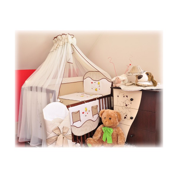 7. Moskitiera z szyfonu 480 x 160 cm – dużych rozmiarów moskitiera zabezpieczająca łóżeczko dziecięce przed owadami, w tym komarami i muchami. Przysłania całe łóżeczko. Wykonana z gęsto tkanego, delikatnego, ale wytrzymałego szyfonu wykończonego lamówką dobraną kolorystycznie do całości pościeli. Na górze dodatkowa warstwa bawełny (jak na pościel), a także ozdobna kokarda szyfonowa.