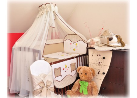 7. Moskitiera z szyfonu 480 x 160 cm - zasłania całe łóżeczko zabezpieczając malucha przed różnymi owadami przy tym pięknie się prezentuje. Odpowiednia długość i szerokość zabezpiecza całe łóżeczko. Może być zakładana na długim i krótkim boku, Wykonana z delikatnego szyfonu wykończony dobraną kolorystycznie lamówką . Górę moskitiery zdobi dodatkowa warstwa tkaniny bawełnianej z takiej samej tkaniny jak pościel oraz kokardka wykonana również z szyfonu.