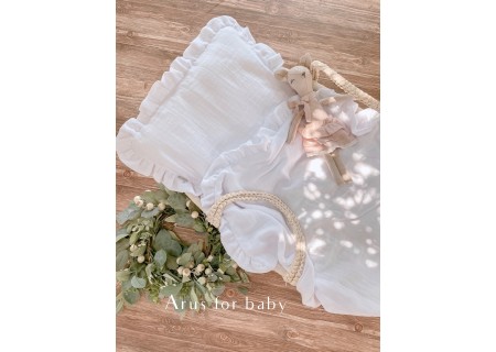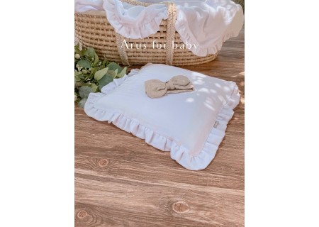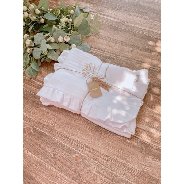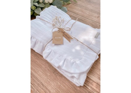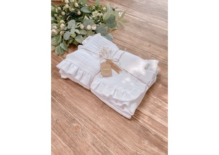 Komplet pościeli muślinowej z nowej kolekcji Premium Eco Muslin w rozmiarze 120x90. Poszewka na poduszkę w rozmiarze 60x40 z trzech stron obszyta falbanką, na jednej ze stron znajduje się kryty zamek. Poszewka na Kołderkę posiada od góry wszytą falbankę.