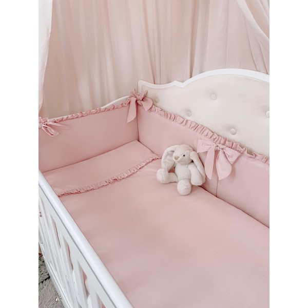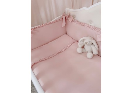Pościel dziecięca z kolekcji „AMELIA” wykona z bawełny w jednolitym kolorze, dodatek stanowi falbanka. Poszewka kołderki z wszyta falbanką nadaje jej niezwykłej prostoty z zarazem klasy . Poszewka poduszki obszyta falbanką z trzech stron tak aby nie uwierała małej główki, zapinana na suwaczek. Ochraniacz z falbankami wiązany na szerokie kokardy. Całość wykonana atestowanej bawełny najwyższej jakości . Polska produkcja firmy ARUŚ.