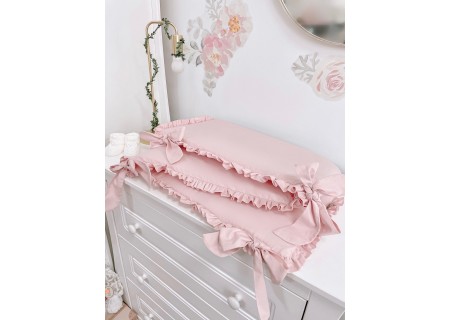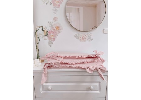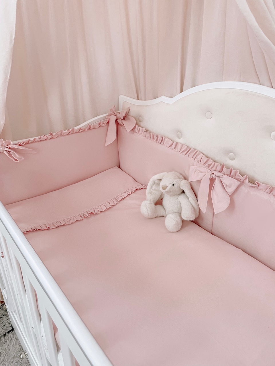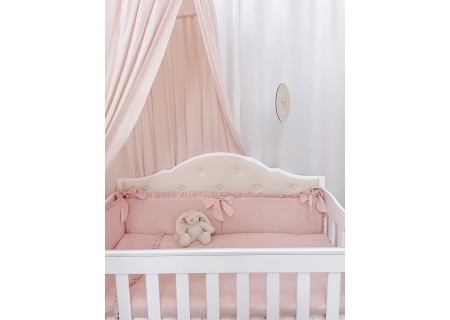 3. Ochraniacz30 x 180 cm – zapewnia skuteczne zabezpieczanie główki dziecka przed uderzeniami o szczebelki. W skład ochraniacza wchodzą trzy poduszki (wkłady) wykończone białą bawełną i wypełnione puszystą prasowana włókniną poliestrową, a także trzy poszewki z zameczkiem. Dzięki takiej konstrukcji można łatwo utrzymać ochraniacz w czystości. Poszewki ochraniacza wykończone od góry bawełnianą falbanką, przymocowywany do łóżeczka szerokimi wiązaniami tworzącymi dużą kokardkę.