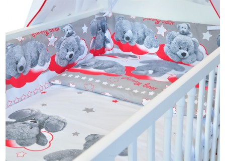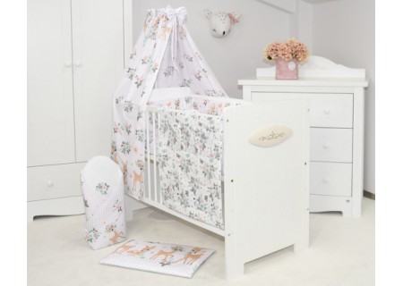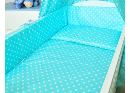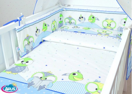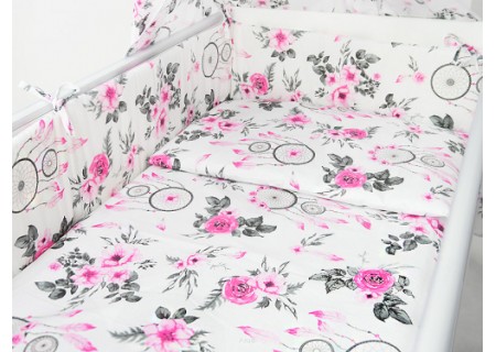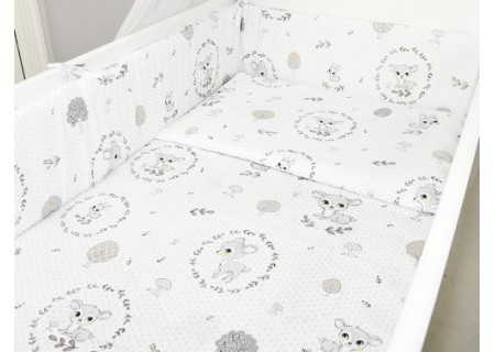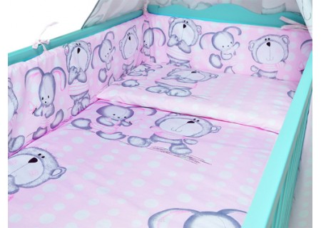 3. Ochraniacz na szczebelki 180 x 20 cm – sztywny i gruby ochraniacz wykonany z prasowanej wlokniny , która zapewnia bardzo skuteczną ochronę przed uderzeniami główni dziecka o szczebelki. Ochraniacz mocowany jest na troczki, które wykonane są z tej samej tkaniny, która posłużyła do szycia pościeli. Ochraniacz jest dwustronny moze byc wiec zakladany wg wlasnego uznania