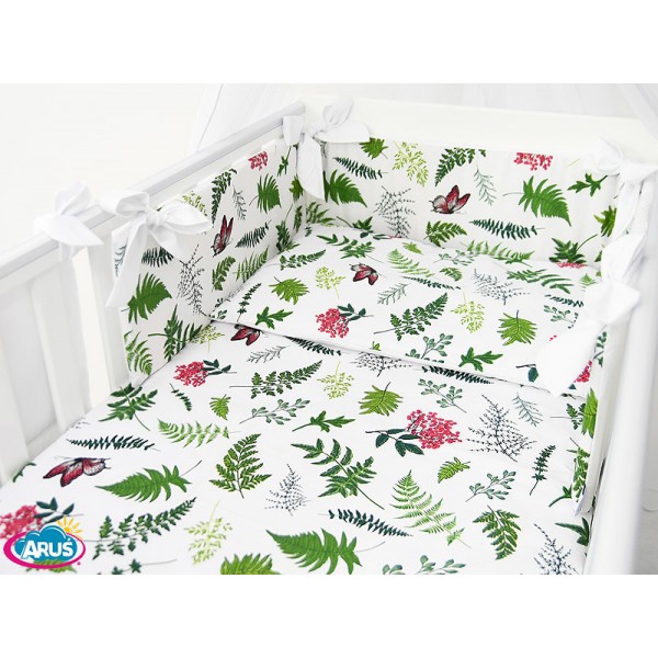 3. Ochraniacz na szczebelki 180 x 20 cm – sztywny i gruby ochraniacz wykonany z prasowanej wlokniny , która zapewnia bardzo skuteczną ochronę przed uderzeniami główni dziecka o szczebelki. Ochraniacz mocowany jest dużymi kokardkami, które wykonane są z tej samej tkaniny, która posłużyła do szycia pościeli. Ochraniacz jest dwustronny moze byc wiec zakladany wg wlasnego uznania