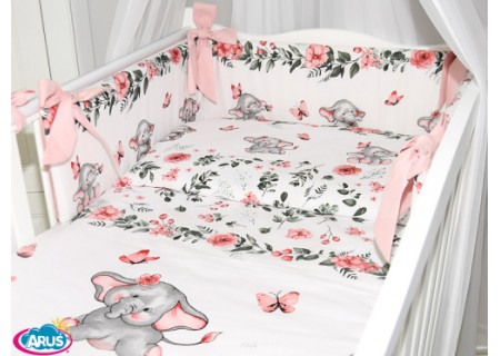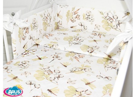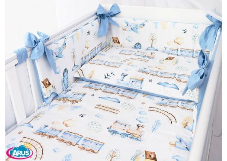 3. Ochraniacz na szczebelki 180 x 20 cm – sztywny i gruby ochraniacz wykonany z prasowanej wlokniny , która zapewnia bardzo skuteczną ochronę przed uderzeniami główni dziecka o szczebelki. Ochraniacz mocowany jest dużymi kokardkami, które wykonane są z tej samej tkaniny, która posłużyła do szycia pościeli. Ochraniacz jest dwustronny moze byc wiec zakladany wg wlasnego uznania