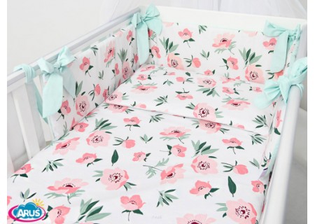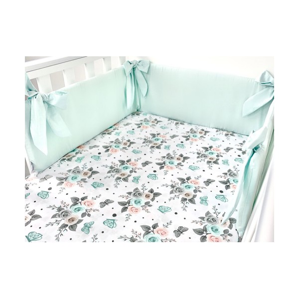 3 el.Pościel do łóżeczka 120x90 dwustronna "KOKARDKA" (różyczki białe +mięta)