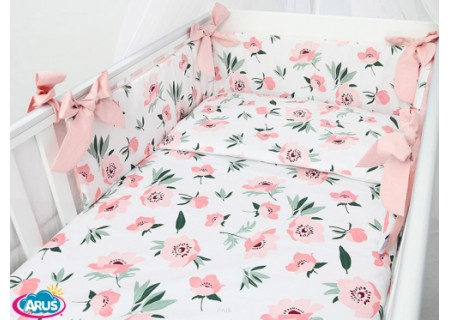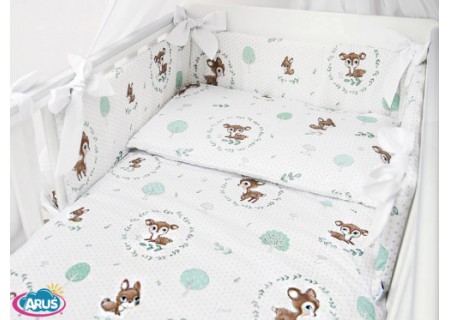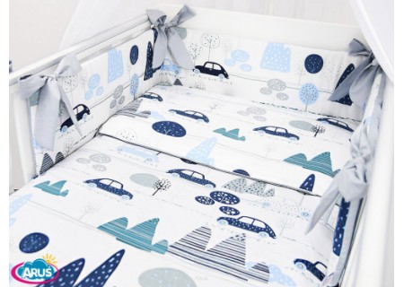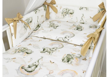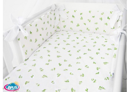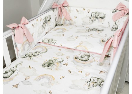 3. Ochraniacz na szczebelki 180 x 20 cm – sztywny i gruby ochraniacz wykonany z prasowanej wlokniny , która zapewnia bardzo skuteczną ochronę przed uderzeniami główni dziecka o szczebelki. Ochraniacz mocowany jest dużymi kokardkami, które wykonane są z tej samej tkaniny, która posłużyła do szycia pościeli. Ochraniacz jest dwustronny moze byc wiec zakladany wg wlasnego uznania