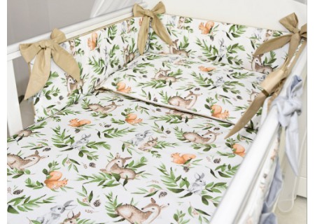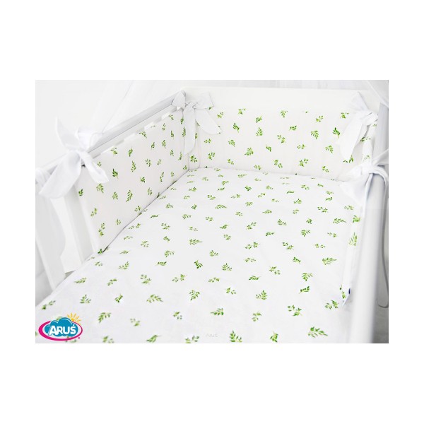3 el.Pościel do łóżeczka 120x90 dwustronna "KOKARDKA" (zielone gałązki +biały gładki)