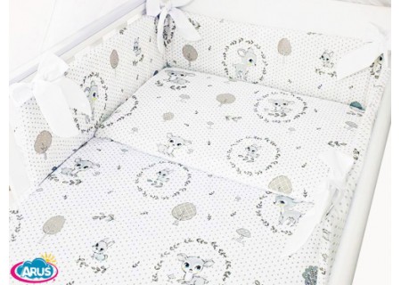 3. Ochraniacz na szczebelki 180 x 20 cm – sztywny i gruby ochraniacz wykonany z prasowanej wlokniny , która zapewnia bardzo skuteczną ochronę przed uderzeniami główni dziecka o szczebelki. Ochraniacz mocowany jest dużymi kokardkami, które wykonane są z tej samej tkaniny, która posłużyła do szycia pościeli. Ochraniacz jest dwustronny moze byc wiec zakladany wg wlasnego uznania