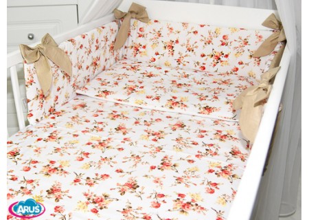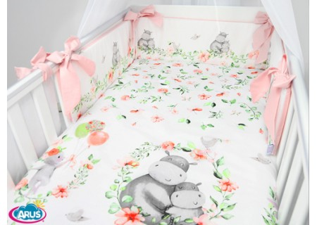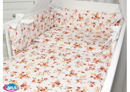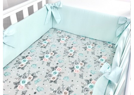 3. Ochraniacz na szczebelki 180 x 20 cm – sztywny i gruby ochraniacz wykonany z prasowanej wlokniny , która zapewnia bardzo skuteczną ochronę przed uderzeniami główni dziecka o szczebelki. Ochraniacz mocowany jest dużymi kokardkami, które wykonane są z tej samej tkaniny, która posłużyła do szycia pościeli. Ochraniacz jest dwustronny moze byc wiec zakladany wg wlasnego uznania