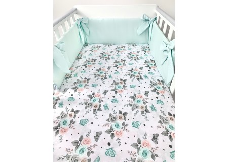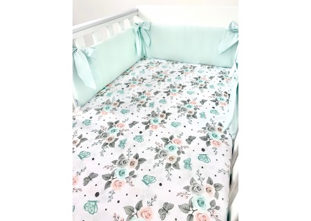 3 el.Pościel do łóżeczka 120x90 dwustronna "Summer" różyczki białe + mięta