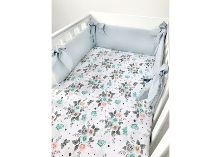 3 el.Pościel do łóżeczka 120x90 dwustronna "Summer" różyczki białe + szary