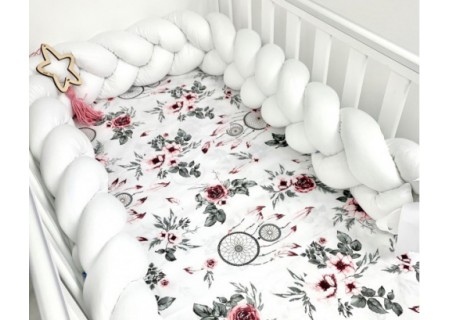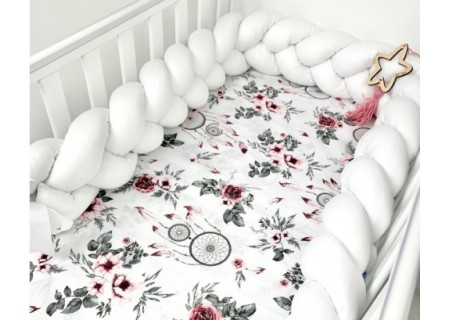 3. Ochraniacz / warkocz / gniazdko / kojec Zapewnia bezpieczny spokojny sen każdego maluszka, zabezpiecza go przed uderzeniami o szczebelki łóżeczka. Ochraniacz można wykorzystać jako spleciony warkocz  lub też każdy z elementów warkocza można przepleść między szczebelkami łóżeczka.Ochraniacz może zabezpieczyć krótkie boki łóżeczka oraz długi bok , jak również można go umieści za głową dziecka + po prawej i lewej stronie . Może być wykorzystywany jako gniazdko do zabawy, zawiązany kokardkami dodającymi uroku całości. Starannie wykonany zapewnia długotrwałe użytkowanie. Jednolity kolor sprawia że ochraniacz -warkocz bedzie uniwersalny do wielu wzorów.