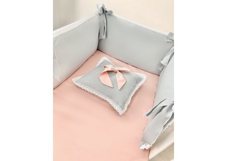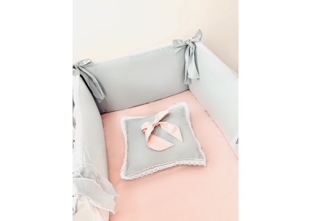 3. Ochraniacz (zagłówek + 2 boczne osłonki) składający się z trzech części o wymiarach ok. 35 x 60 cm – zapewnia skuteczne zabezpieczanie główki dziecka przed uderzeniami o szczebelki. W skład ochraniacza wchodzą trzy poduszki (wkłady) wykończone bawełną i wypełnione puszystą owatą, a także trzy poszewki z zameczkiem. Dzięki takiej konstrukcji można łatwo utrzymać ochraniacz w czystości. Całość obszyta koronką. Ochraniacz jest przymocowywany do łóżeczka na kokardy.