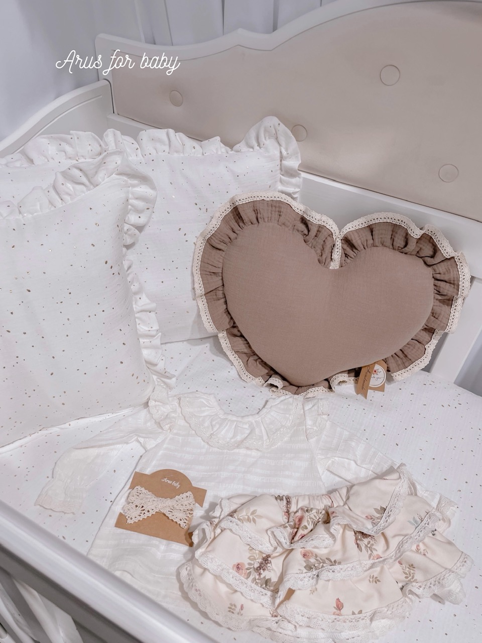 Poduszka z kolekcji Eco muślin premium w kształcie serca, wykończona koronkową falbanką.