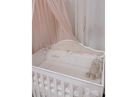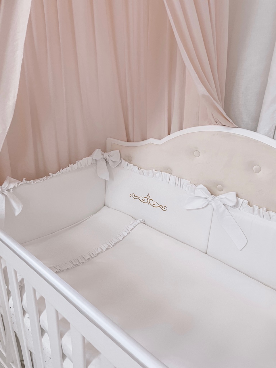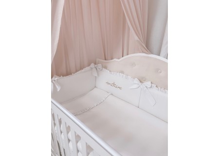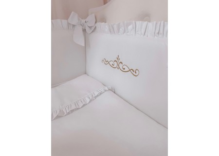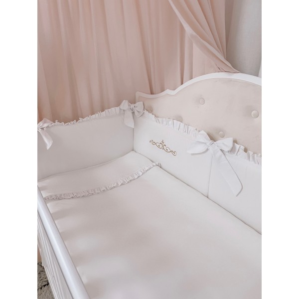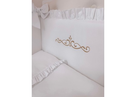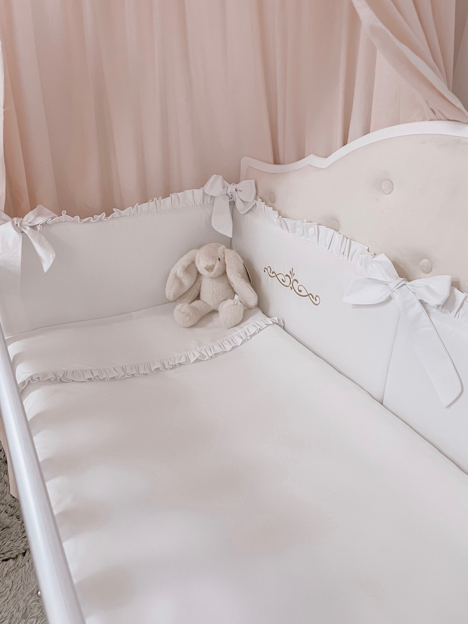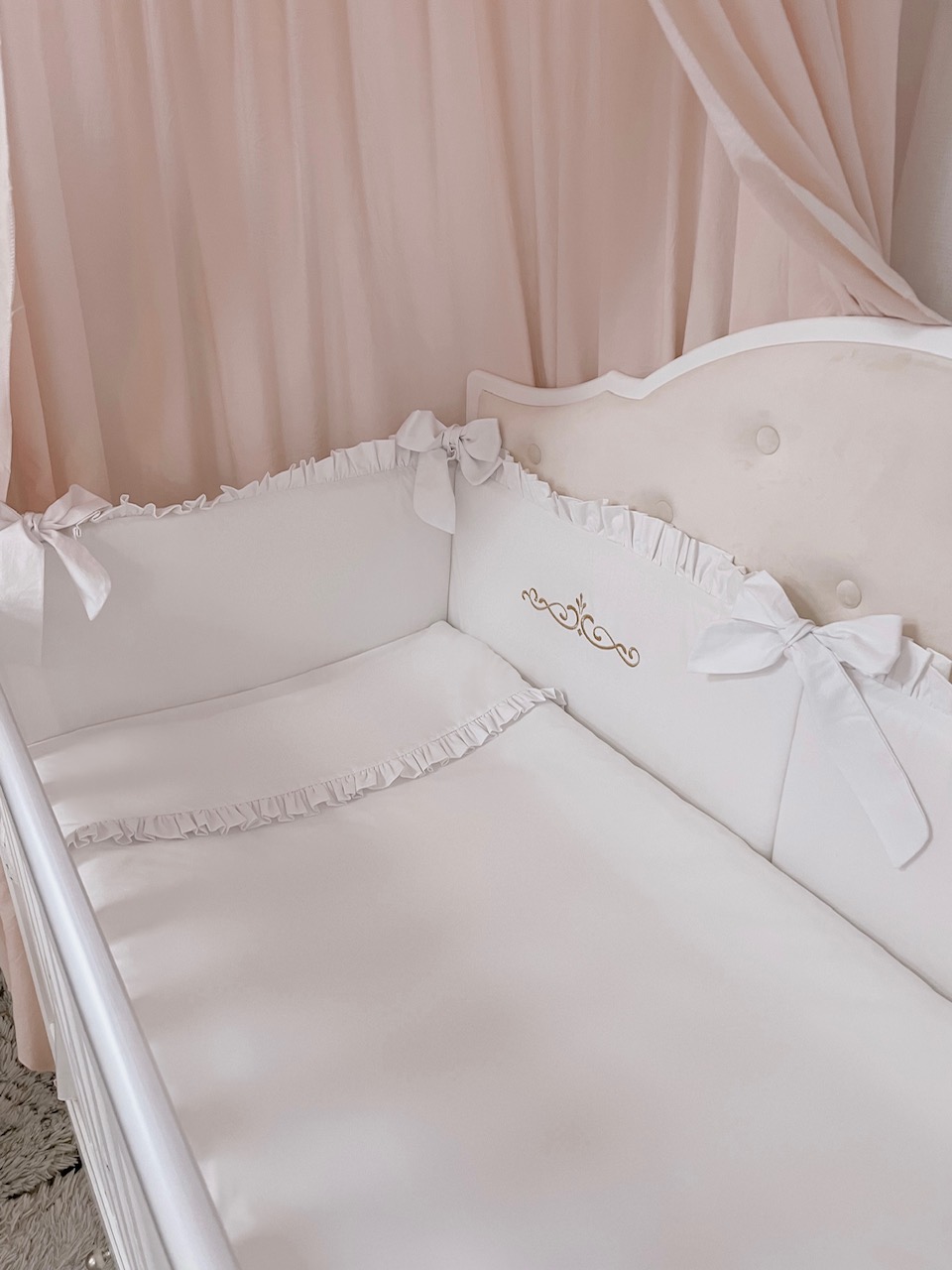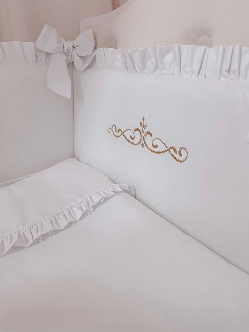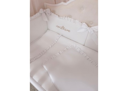 Pościel dziecięca z kolekcji „AMELIA” wykona z bawełny w jednolitym kolorze, dodatek stanowi falbanka. Poszewka kołderki z wszyta falbanką nadaje jej niezwykłej prostoty z zarazem klasy . Poszewka poduszki obszyta falbanką z trzech stron tak aby nie uwierała małej główki, zapinana na suwaczek. Ochraniacz z falbankami wiązany na szerokie kokardy. Całość wykonana atestowanej bawełny najwyższej jakości . Polska produkcja firmy ARUŚ.