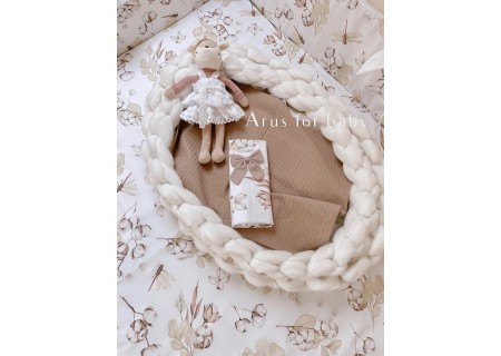 3. Ochraniacz na szczebelki 180 x 20 cm – sztywny i gruby ochraniacz wykonany z prasowanej wlokniny , która zapewnia bardzo skuteczną ochronę przed uderzeniami główni dziecka o szczebelki. Ochraniacz mocowany jest dużymi kokardkami, które wykonane są z tej samej tkaniny, która posłużyła do szycia pościeli. Ochraniacz jest dwustronny moze byc wiec zakladany wg wlasnego uznania