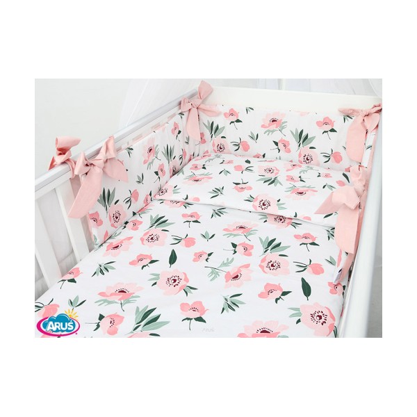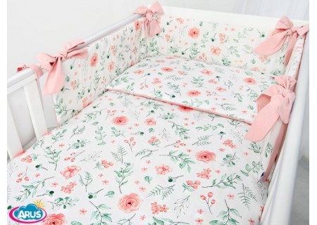 3. Ochraniacz na szczebelki 180 x 20 cm – sztywny i gruby ochraniacz wykonany z prasowanej wlokniny , która zapewnia bardzo skuteczną ochronę przed uderzeniami główni dziecka o szczebelki. Ochraniacz mocowany jest dużymi kokardkami, które wykonane są z tej samej tkaniny, która posłużyła do szycia pościeli. Ochraniacz jest dwustronny moze byc wiec zakladany wg wlasnego uznania