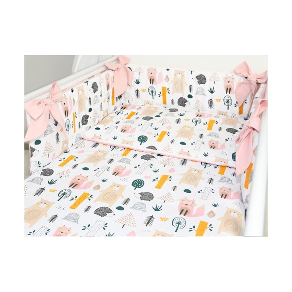 3. Ochraniacz na szczebelki 180 x 20 cm – sztywny i gruby ochraniacz wykonany z prasowanej wlokniny , która zapewnia bardzo skuteczną ochronę przed uderzeniami główni dziecka o szczebelki. Ochraniacz mocowany jest dużymi kokardkami, które wykonane są z tej samej tkaniny, która posłużyła do szycia pościeli. Ochraniacz jest dwustronny moze byc wiec zakladany wg wlasnego uznania