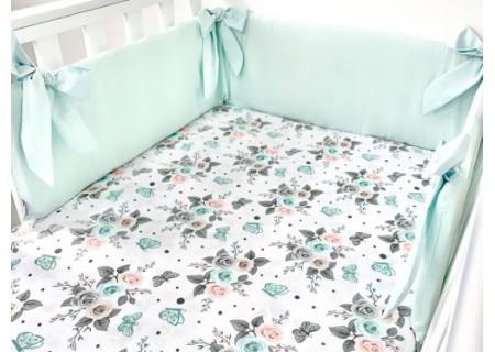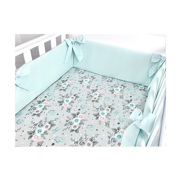 5 el.Pościel do łóżeczka 120x90 dwustronna "KOKARDKA" (różyczki popielate +mięta)