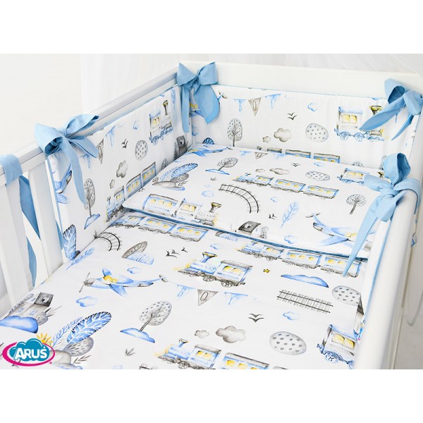 3. Ochraniacz na szczebelki 180 x 20 cm – sztywny i gruby ochraniacz wykonany z prasowanej wlokniny , która zapewnia bardzo skuteczną ochronę przed uderzeniami główni dziecka o szczebelki. Ochraniacz mocowany jest dużymi kokardkami, które wykonane są z tej samej tkaniny, która posłużyła do szycia pościeli. Ochraniacz jest dwustronny moze byc wiec zakladany wg wlasnego uznania