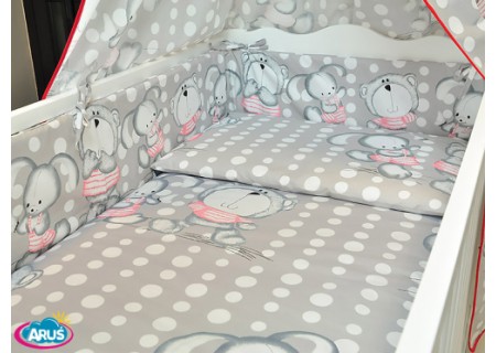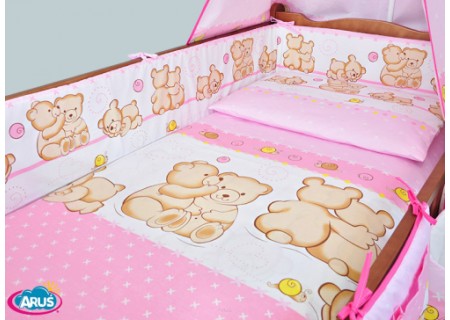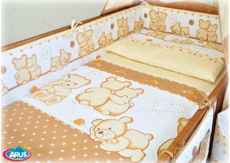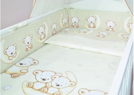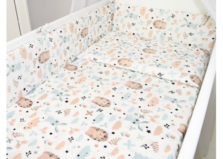 3. Ochraniacz na szczebelki 180 x 20 cm – sztywny i gruby ochraniacz wykonany z prasowanej wlokniny , która zapewnia bardzo skuteczną ochronę przed uderzeniami główni dziecka o szczebelki. Ochraniacz mocowany jest na troczki, które wykonane są z tej samej tkaniny, która posłużyła do szycia pościeli. Ochraniacz jest dwustronny moze byc wiec zakladany wg wlasnego uznania