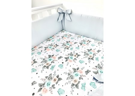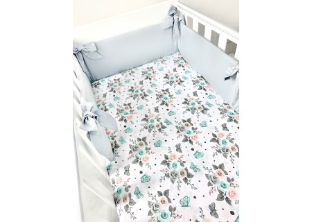 5 el.Pościel do łóżeczka 120x90 dwustronna "Summer" różyczki białe + szary
