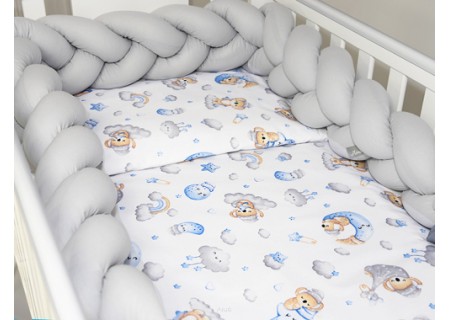 1. Poszewkę  na kołderkę 120 x 90 cm – poszwa została wyposażona w plastikowy suwaczek bezpieczny dla dziecka. Suwaczek umieszczony jest po szerokości poszwy na połączeniu tkanin , co sprawia że poszwa jest dwustronna a zamek nie ugniata.  100% bawełna atestowana, najlepszej jakości dla maksymalnego komfortu snu dziecka. Do uszycia poszwy wykorzystano tkaniny w dwóch kolorach .