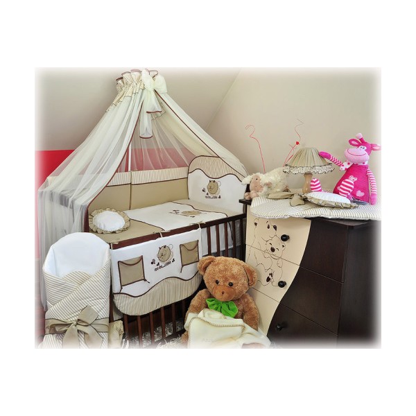 5 el.Pościel do łóżeczka 120x90 z moskitierą "PASKI" (beżowy kotek)