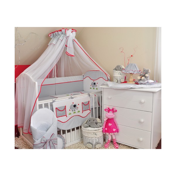 5. Moskitiera z szyfonu 480 x 160 cm – dużych rozmiarów moskitiera zabezpieczająca łóżeczko dziecięce przed owadami, w tym komarami i muchami. Przysłania całe łóżeczko. Wykonana z gęsto tkanego, delikatnego, ale wytrzymałego szyfonu wykończonego lamówką dobraną kolorystycznie do całości pościeli. Na górze dodatkowa warstwa bawełny (jak na pościel), a także ozdobna kokarda szyfonowa.