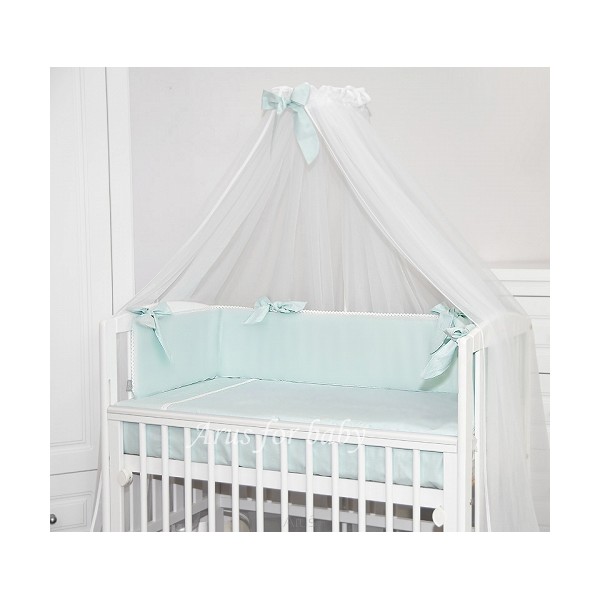 5. Ochraniacz na szczebelki 180 x 20 cm – wykończony bawełnianą koronką , wiązany na duże kokardy, sztywny i gruby ochraniacz wykonany z prasowanej wlokniny , która zapewnia bardzo skuteczną ochronę przed uderzeniami główni dziecka o szczebelki.