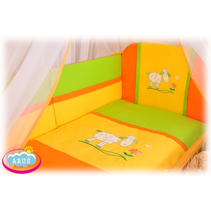 6. Dwie boczne osłonki wysokie na 30 cm- zabezpieczają malucha przed uderzeniem o boczne szczebelki .Poszycie stanowi połączenie połączenie tkanin w różnych kolorach z kolorową wypustka. Z racji tego że osłonki boczne nie są na stałe połączone z zagłówkiem można je dowolnie montować na bokach łóżeczka. Można zabezpieczyć np. cały jeden długi bok jednocześnie widząc maluszka jeżeli mamy łóżeczko przysunięte do własnego łóżka.