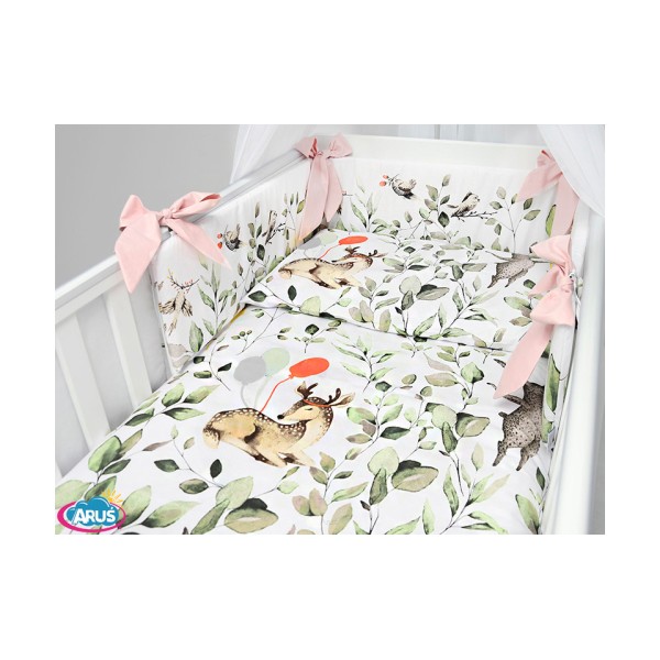 3. Ochraniacz na szczebelki 180 x 20 cm – sztywny i gruby ochraniacz wykonany z prasowanej wlokniny , która zapewnia bardzo skuteczną ochronę przed uderzeniami główni dziecka o szczebelki. Ochraniacz mocowany jest dużymi kokardkami, które wykonane są z tej samej tkaniny, która posłużyła do szycia pościeli. Ochraniacz jest dwustronny moze byc wiec zakladany wg wlasnego uznania