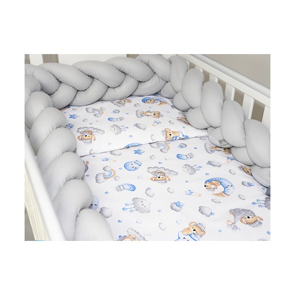 7 el.Pościel do łóżeczka 120x90 "Nature&Flowers" (niebieskie misie na chmurce +popielaty warkocz)
