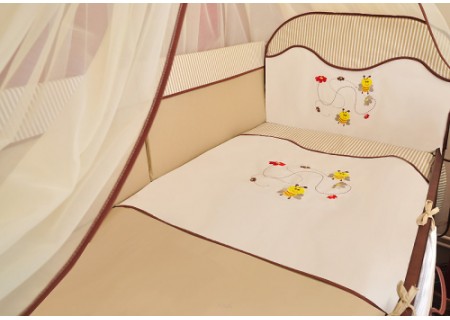 7. Moskitiera z szyfonu 480 x 160 cm – dużych rozmiarów moskitiera zabezpieczająca łóżeczko dziecięce przed owadami, w tym komarami i muchami. Przysłania całe łóżeczko. Wykonana z gęsto tkanego, delikatnego, ale wytrzymałego szyfonu wykończonego lamówką dobraną kolorystycznie do całości pościeli. Na górze dodatkowa warstwa bawełny (jak na pościel), a także ozdobna kokarda szyfonowa.