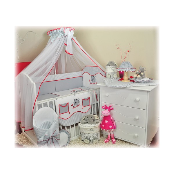 9 el.Pościel do łóżeczka 120x90 z moskitierą "PASKI" (popielaty kotek)