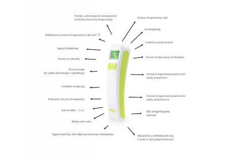 mierzenie temperatury w sposób łatwy i prosty. Najnowszej generacji technologia podczerwieni i lasera czyni pomiar bardzo dokładnym, powtarzalnym i niezawodnym, oraz możliwym do przeprowadzenia w 1 sekundę.