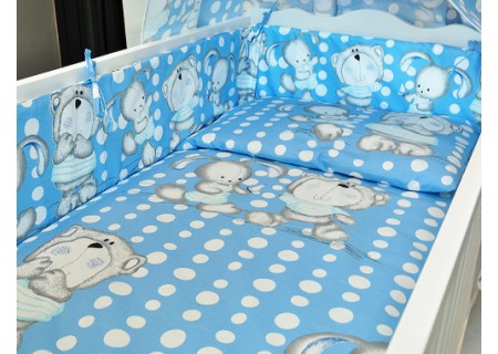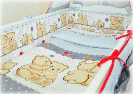 3. Ochraniacz na szczebelki 180 x 20 cm – zapewnia skuteczną ochronę główki dziecka, ponieważ został wykonany ze sztywnej prasowanej włókniny o grubości ok.2 cm. Dzięki swojej sztywności i grubości dobrze zabezpiecza przed uderzeniami o szczebelki. Ochraniacz posiada troczki mocujące do łóżeczka, które zostały uszyte z takiego samego koloru co pościel. Ochraniacz wykonany w systemie EASY WASH, który pozwala na łatwe utrzymanie go w czystości. Pokrowiec ochraniacza wyposażony jest w suwak, aby wyjąć z niego wypełnienie. Pokrowiec można łatwo prać w pralce, a potem wysuszyć i wyprasować, aby cały ochraniacz wyglądał jak nowy.