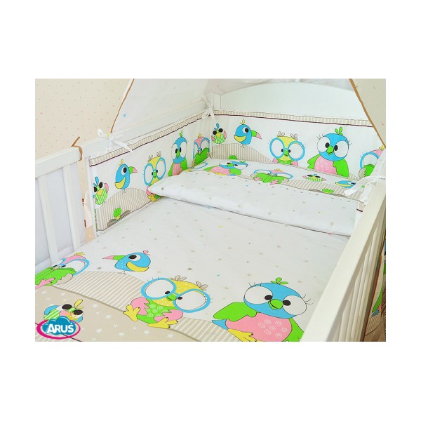 ARUŚ 7 el. pościel do łóżeczka 120*90 (21-bezowe sowy NOWE)