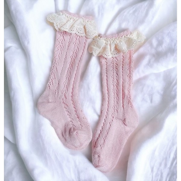 Ażurowe podkolanówki z falbanką pudrowy róż