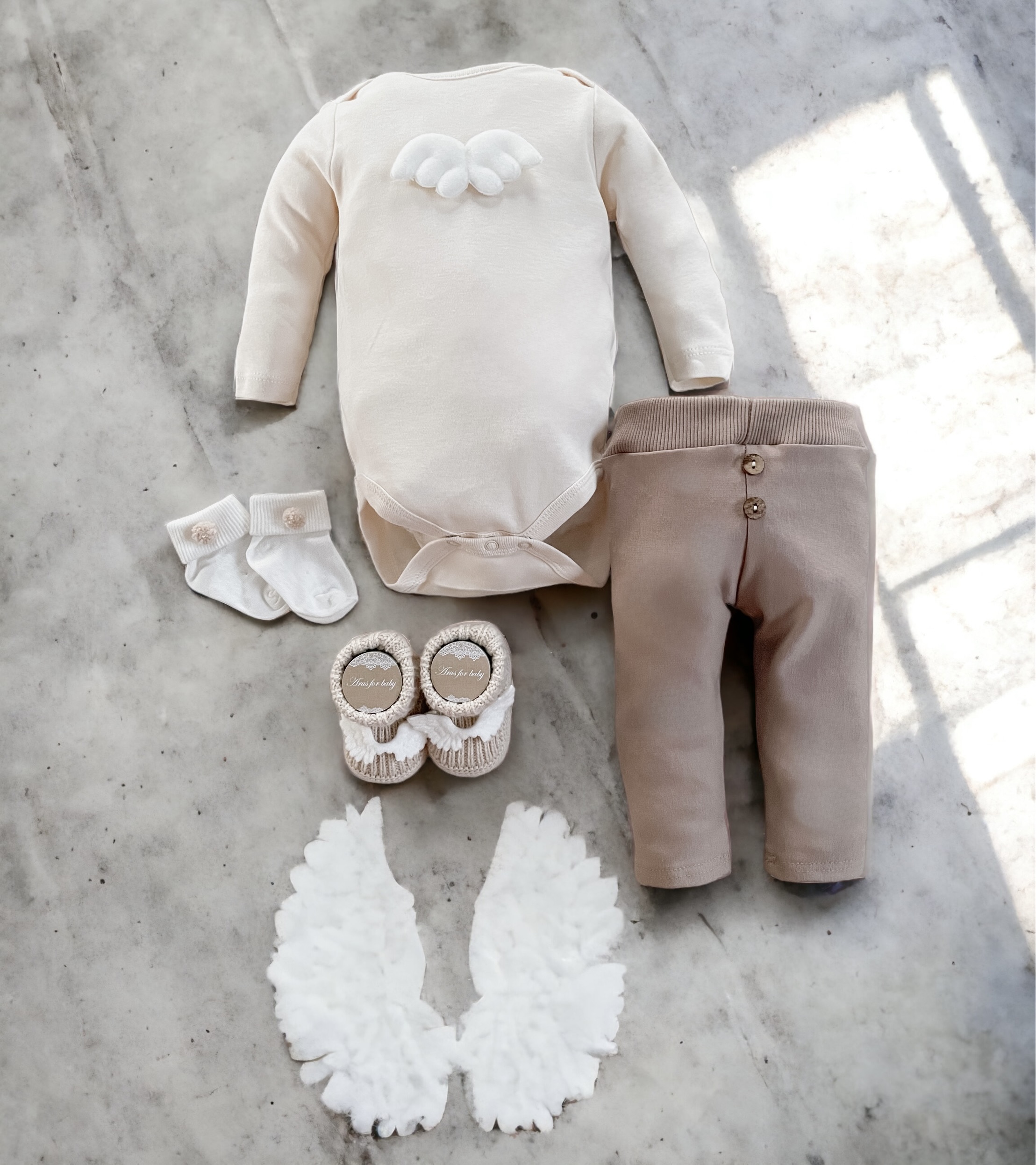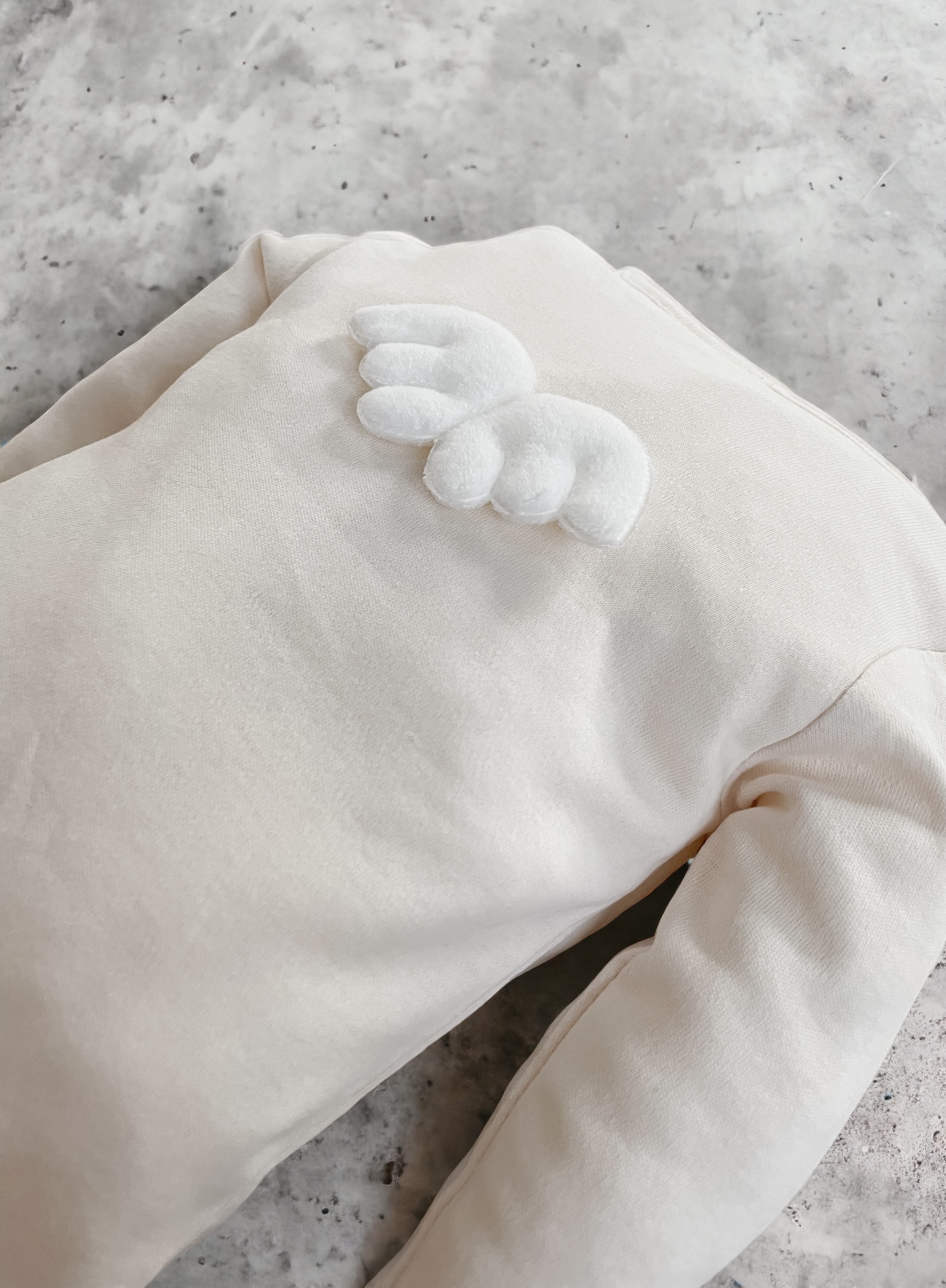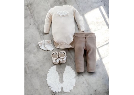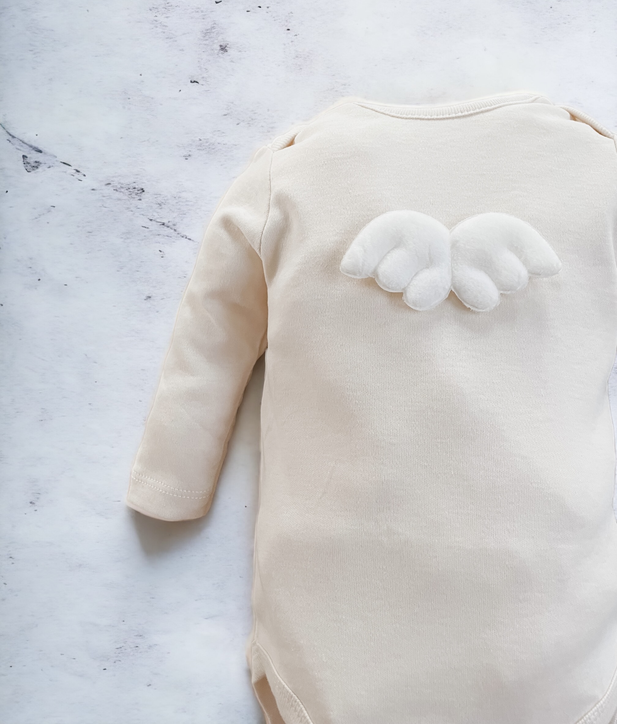 Bawełniane body z aplikacją skrzydeł anioła, zapinane w kroczku na napy.