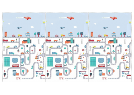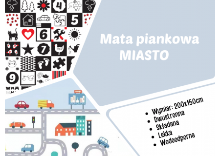 Jeżeli Twój maluch uwielbia bawić się autkami- wybierz wzór MIASTO. Są na nim ulice i domy, które ubarwią zabawę.