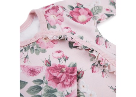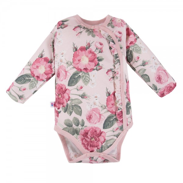 Body niemowlęce rozpinane z długim rękawem z kolekcji "Roses" uszyte z miękkiej i przyjemnej w dotyku dzianiny bawełnianej. Drukowane w nasz autorski wzór róż dzieki czemu nadruk jest delikatny i niewyczuwalny. Krój umożliwia rozpięcie na całej długości, przez co body jest funkcjonalne i wygodne. Body niemowlęce wykończone są miękką lamówką. Przy zapięciu wszyta urocza falbanka. Body niemowlęce idealnie sprawdzają się w pierwszych miesiącach życia dziecka i należą do najczęściej wybieranego asortymentu przez mamy.