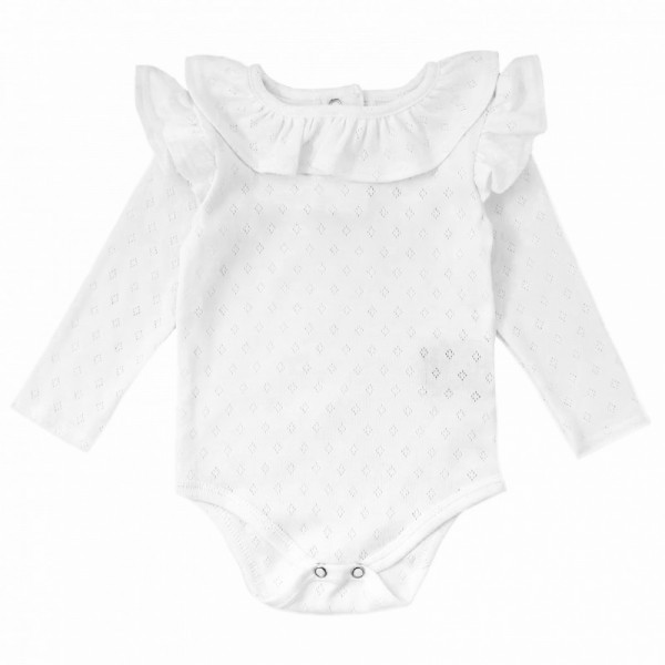 Body z falbankami z ażurowej dzianiny w kolorze białym.