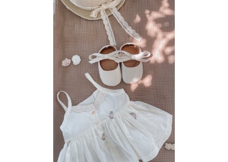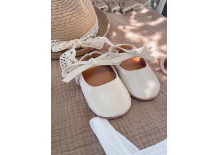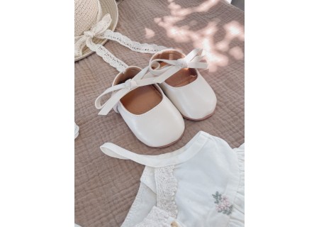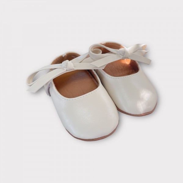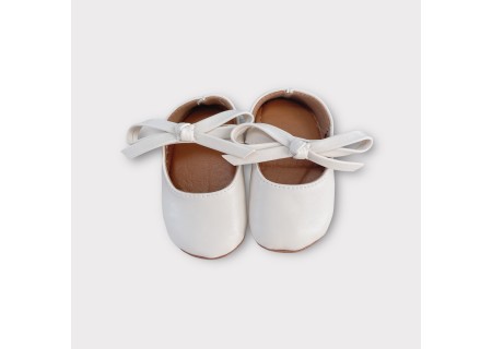 Niemowlęce buciki, swoim stylem przypominające baletki. Gładkie, ozdobnie wykończone paskiem z kokardką. Balerinki idealnie sprawdzą się podczas wszelkich uroczystości czy sesji zdjęciowych.