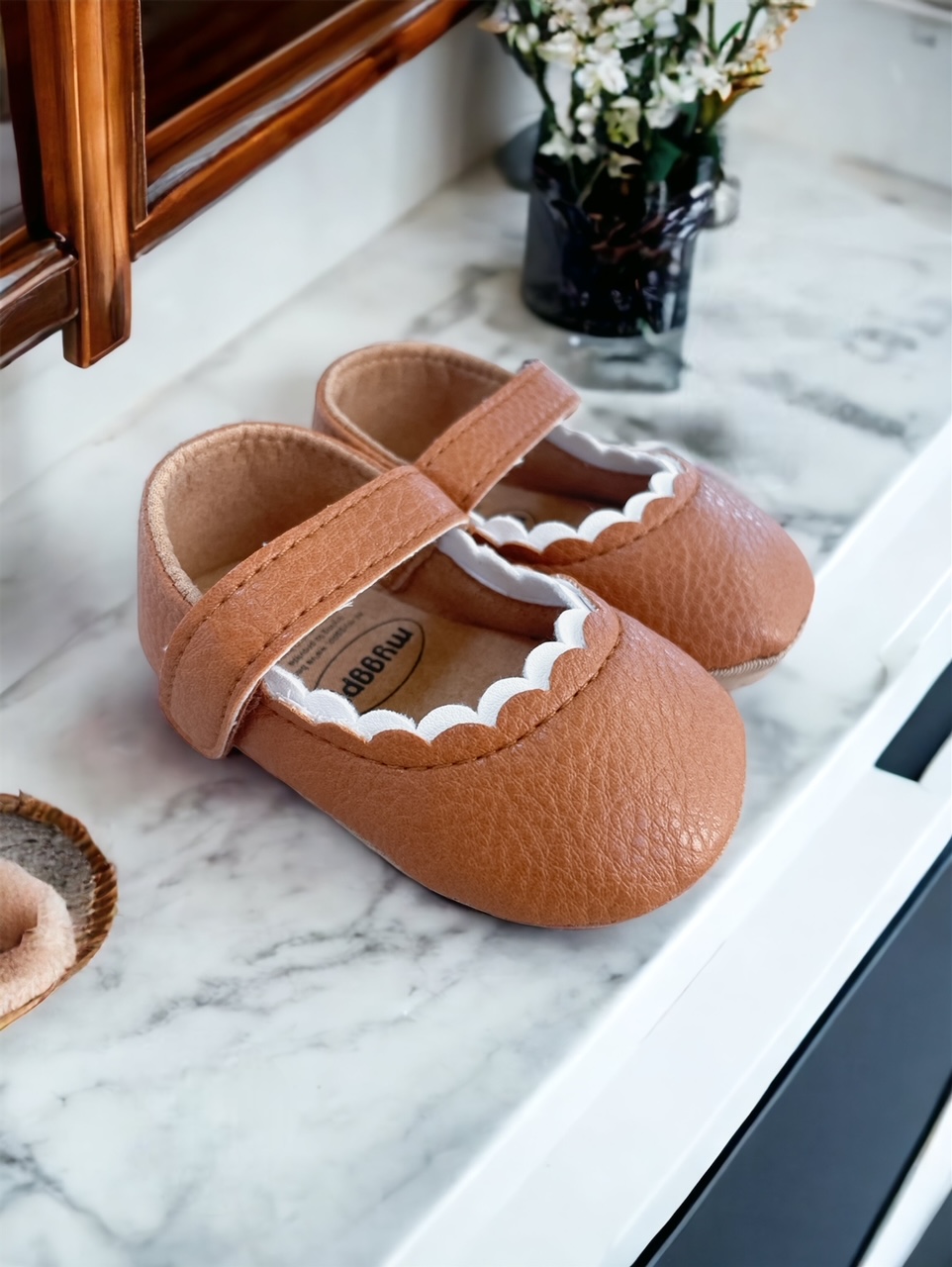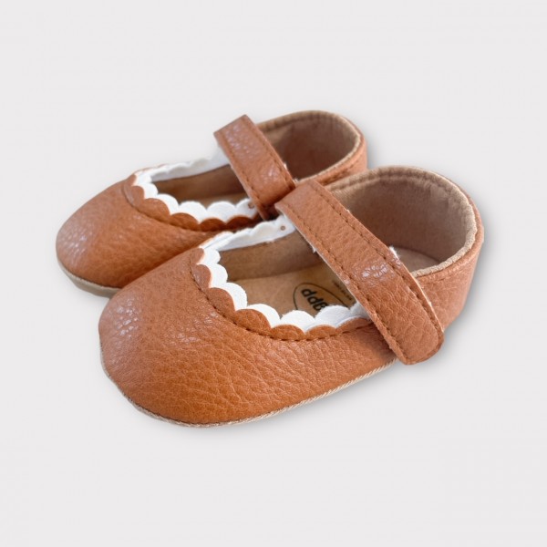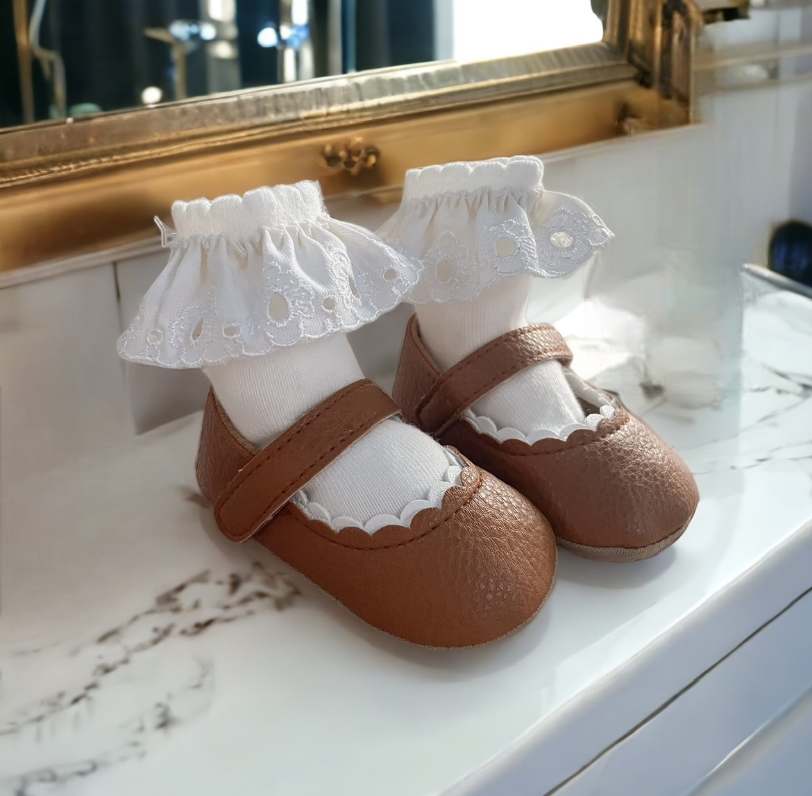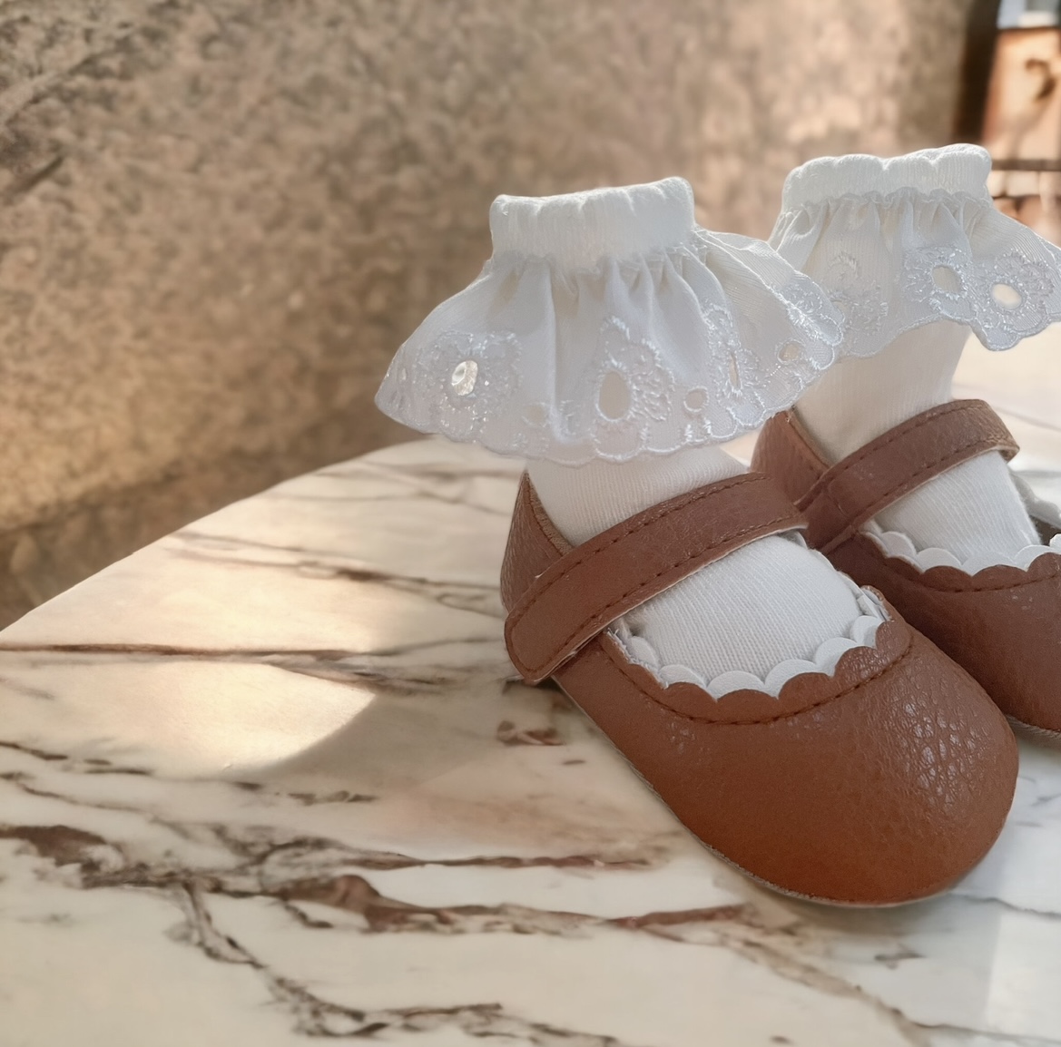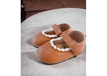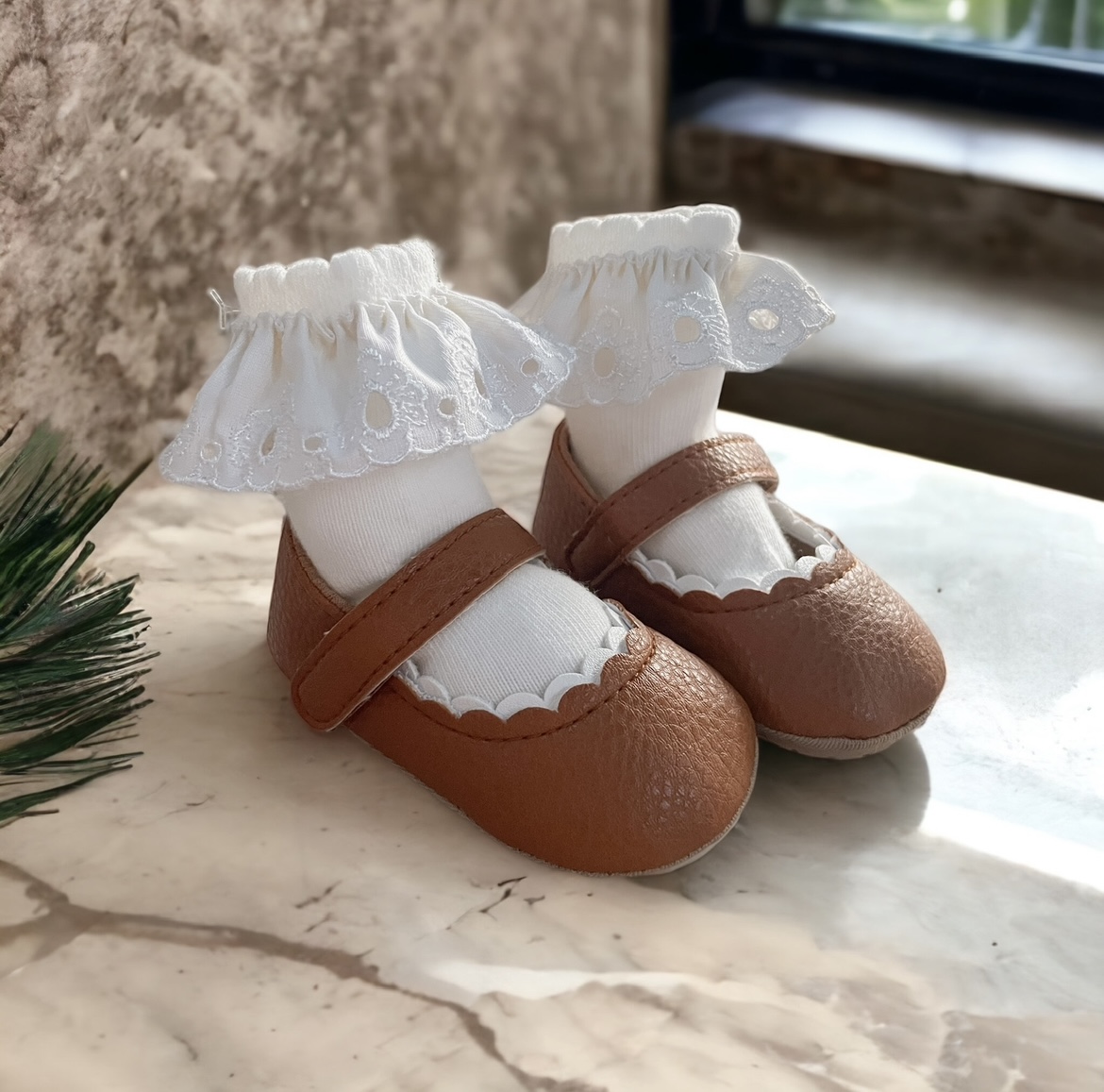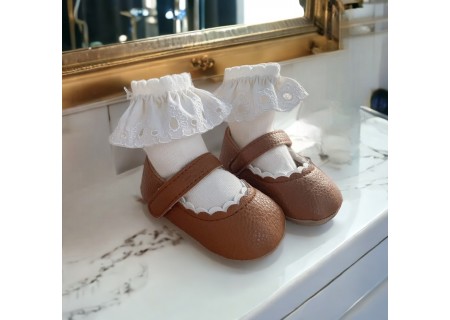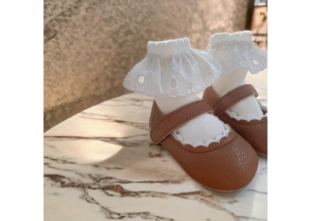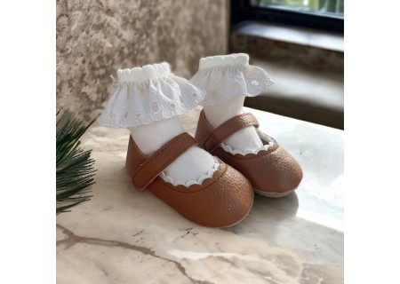 Niemowlęce buciki w stylu retro. Gładkie, ozdobnie wykończone paskiem i falbanką. Balerinki idealnie sprawdzą się podczas wszelkich uroczystości czy sesji zdjęciowych.