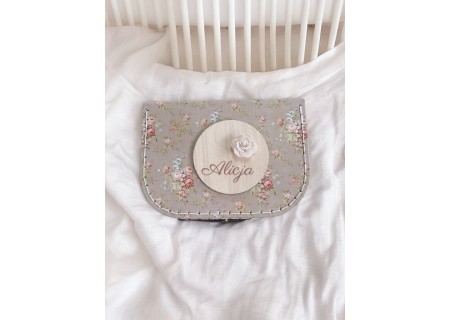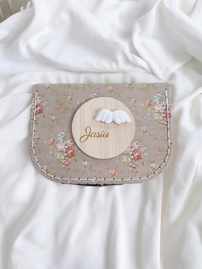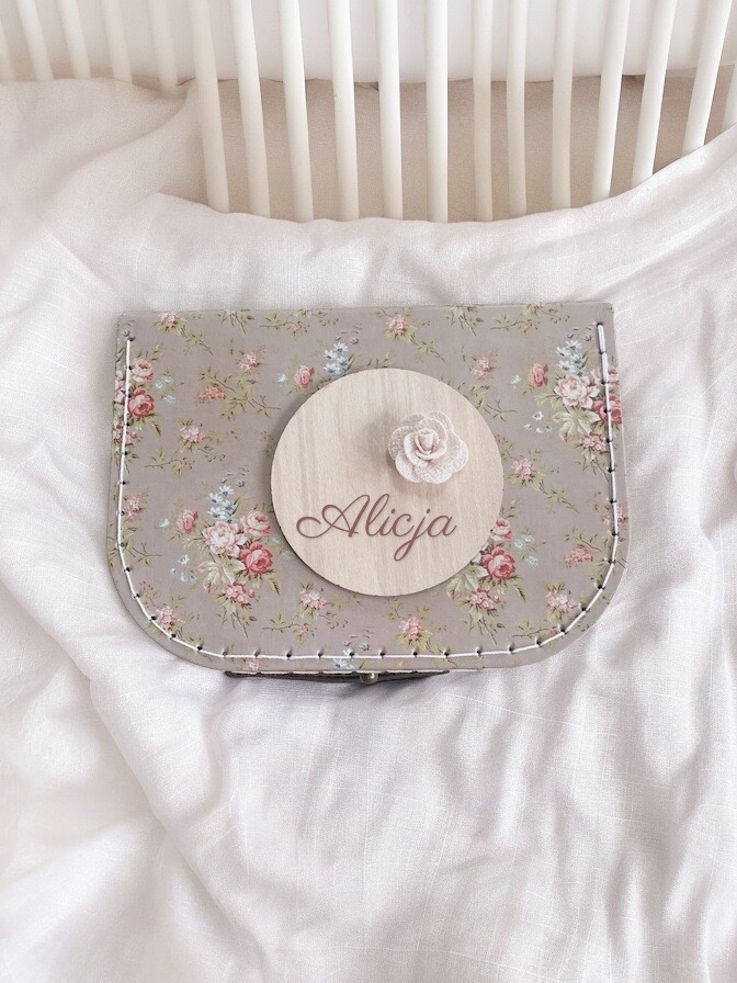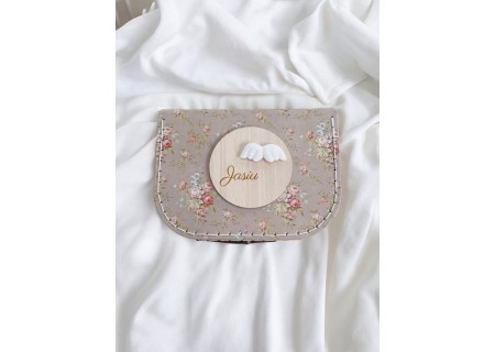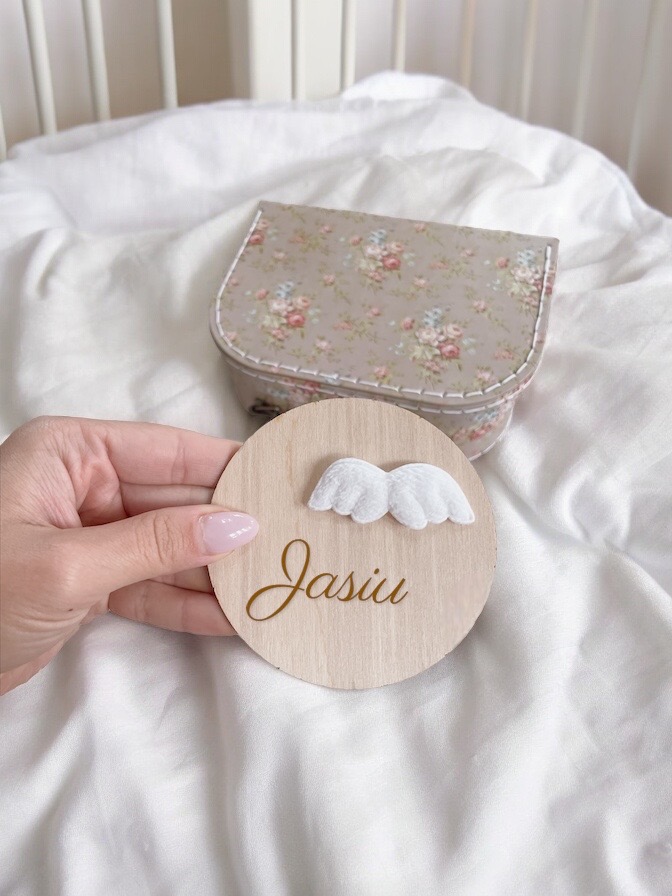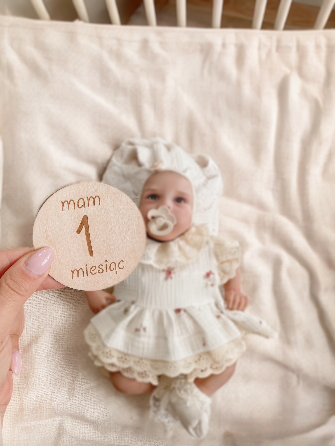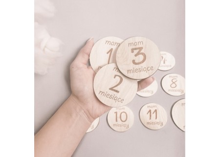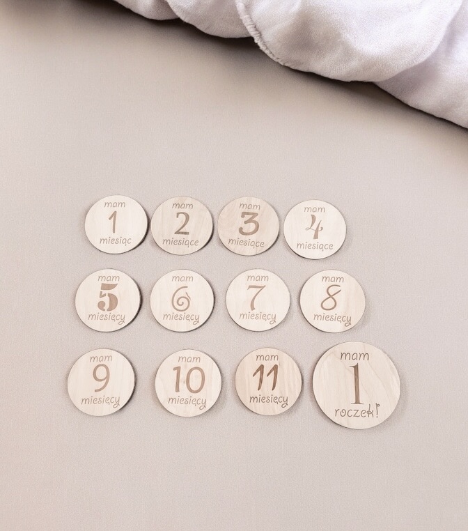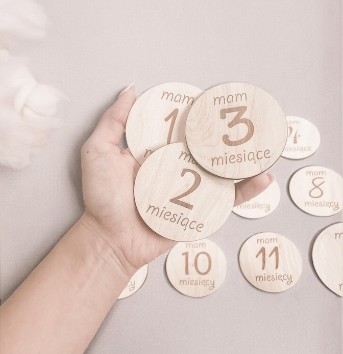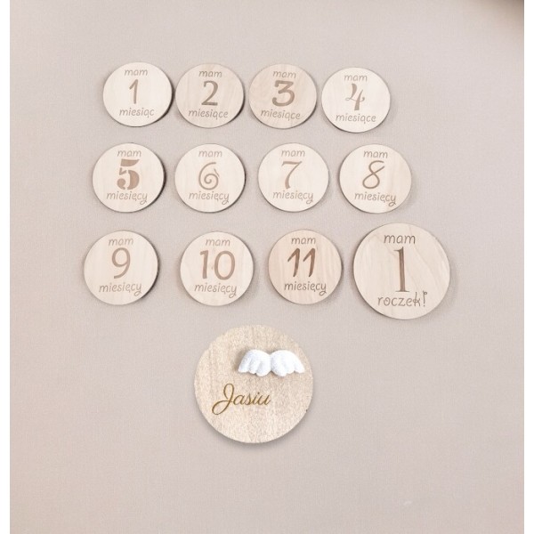 Zestaw 13 drewnianych tabliczek do zdjęć z miesiącami + imienna tabliczka z kwiatuszkiem lub skrzydełkami anioła