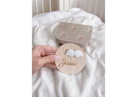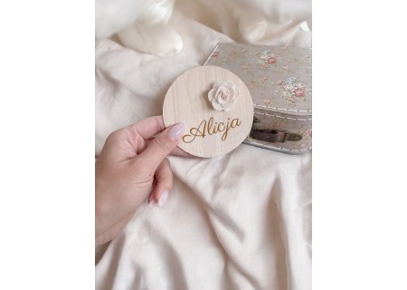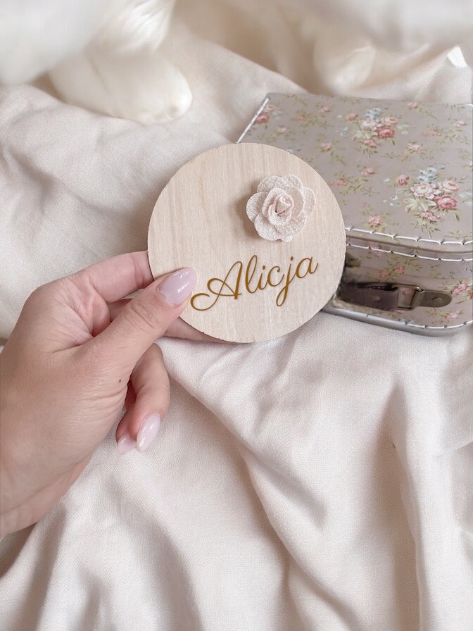 tabliczka z imieniem i aplikacją o średnicy 9cm