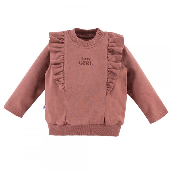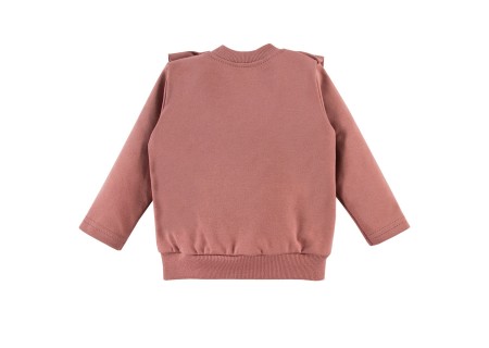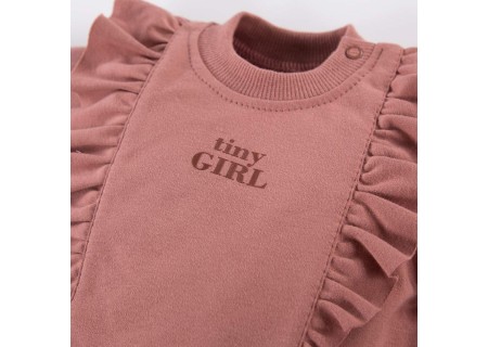 Bluzka dziecięca z falbankami. Jest idealna na spacery oraz zabawę na placu zabaw. Elementem ozdobnym jest nadruk kwiatusza. Bluzka dziecięca pasuje do spodenek tej samej kolekcji.